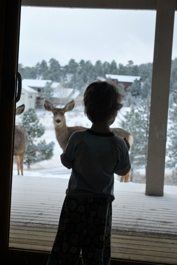 What a well-deserved treat for the mom who loves living in Portland, but misses her snow! Love the deer (elk?) and little guy studying each other… they really trust Meme and Topher, don’t they?