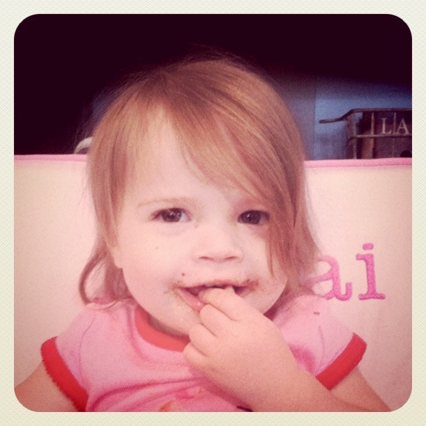 Baby girl was proud of herself for stealthily stealing all of the chocolate chips out of her brothers oatmeal!