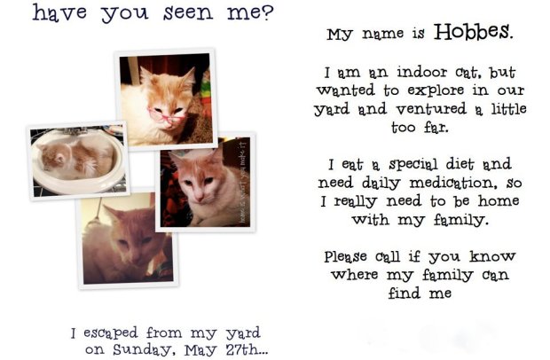 Yesterday, I made flyers and put them on mailboxes and street corners up and down our street.