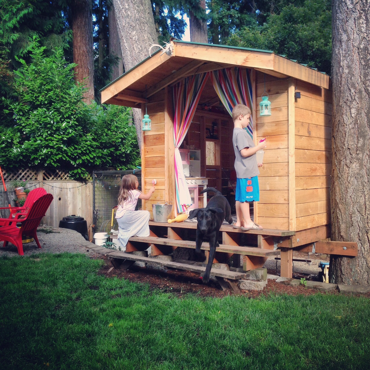 i moved the play kitchen to the playhouse. it’s just perfect out there, except for the black puppy who keeps raiding the kitchen! there might be a few less pieces of wooden food thanks to silly rainy!