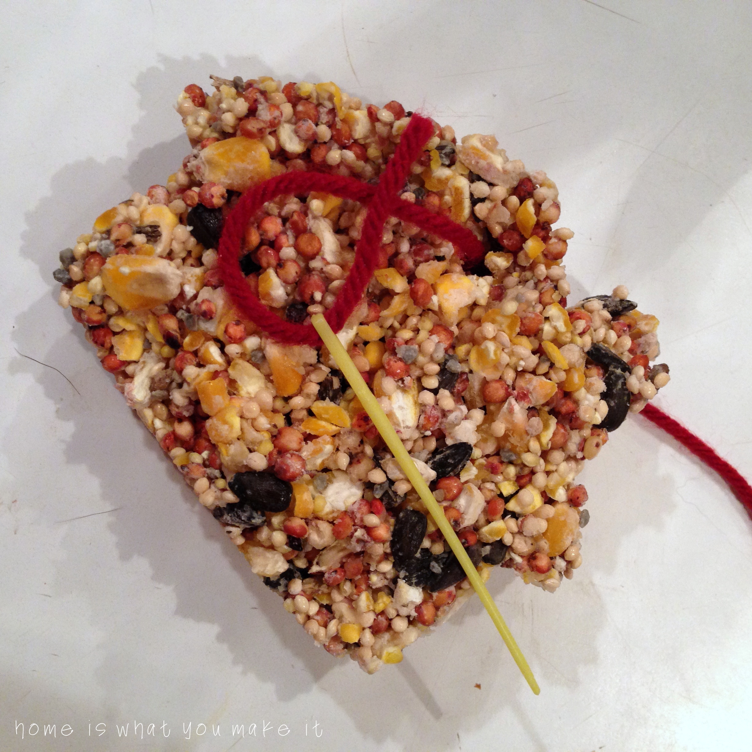 place string through the hole and tie a knot for hanging. any type of string, twine, yarn, ribbon or raffia is suitable {avoid fishing line, however, as it can be dangerous to birds that may find it after the ornaments are consumed}.